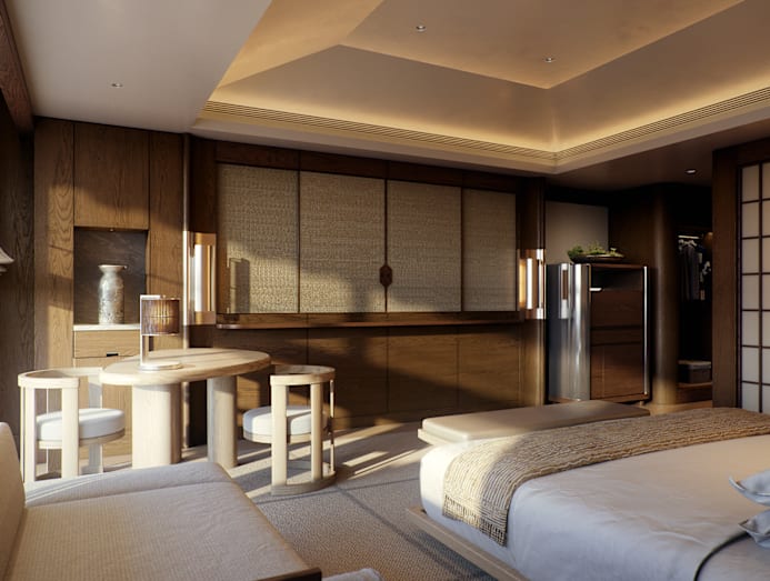 It does not stop there. His influence is also tangible in the design of the headboards. A conversation began with Hosoo Textiles, founded in Kyoto in 1688, but rather than use existing stock, Cheng formed a collaboration with the emerging artist Daichiro Shinjo. Known for Sumi ink paintings in large brushstrokes, Shinjo created a design that was then woven into a custom-made fabric for the headboards.
