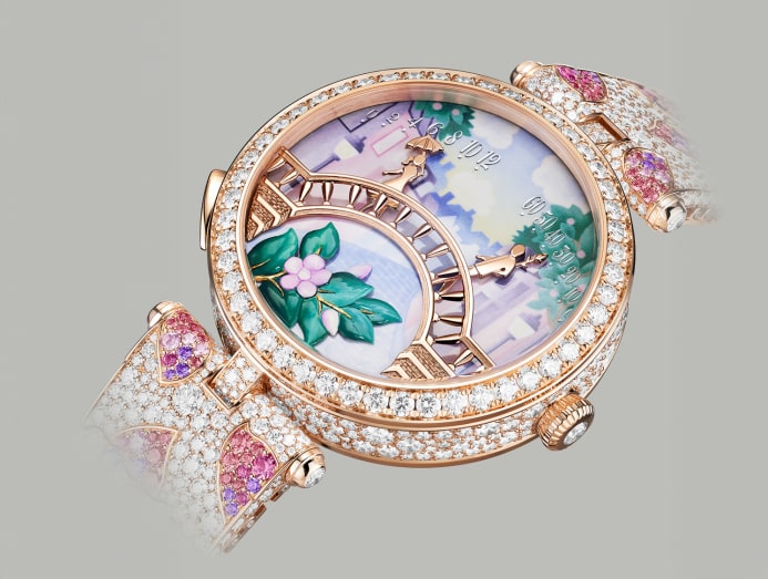 I am very proud of the team for developing our Poetic Complications, where we went beyond creating bejewelled watches with precious stones to using mechanical movements to tell stories in motion. Butterflies fly, ballerinas tell the time and lovers kiss on a bridge – it’s very playful. The beauty of that world is that it’s very whimsical and romantic. We will probably never become a major watch brand, this is not what we do. But we are writing our own story.