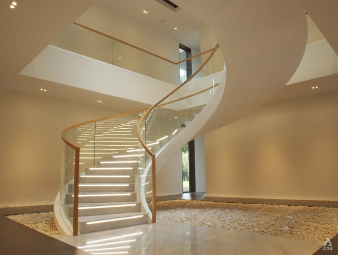 While the interiors are mostly neutral and minimalist, statement sculptural features add visual interest. The loop staircase to the upper floors, which can be lit up at night, is in the centre of the “plus” sign in the house layout. Wiwatkul explained: “We designed it like a sculpture so that when people walk past it, they see the stairs as such in the middle of the house.”