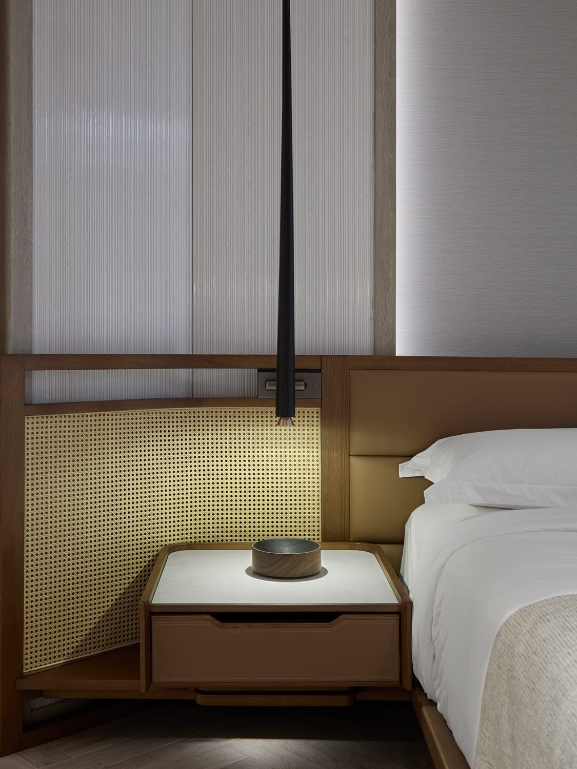 “Everything is streamlined, designed for visual rest so you instantly take a breather,” Chan mentioned. The suite features lime wash and ceramic panels like those in the hotel’s common spaces. But instead of dark timber, the architect used beige solid timber “because it allows you to see the shadows and light a bit more clearly.”