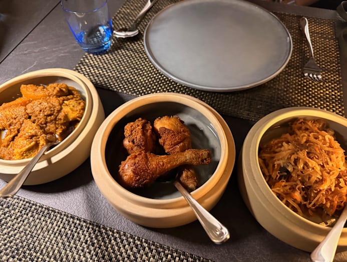 One evening, we were presented with a wooden tingkat of local dishes – spicy curry kapitan (captain’s chicken curry), savoury jiu hoo char (stir-fried vegetables with cuttlefish), tau eu bak (soy sauce pork belly), delicate kueh pie tee cups filled with just the right amount of radish, and fragrant bunga telang-coloured blue rice from Peranakan restaurant BaBa Phang. There were also spring rolls and chicken satay from Ocean Green Restaurant. Dessert was kueh from Michelin-recognised Moh Teng Pheow Nyonya Koay. This was not fine dining per se, but the food was fine indeed.