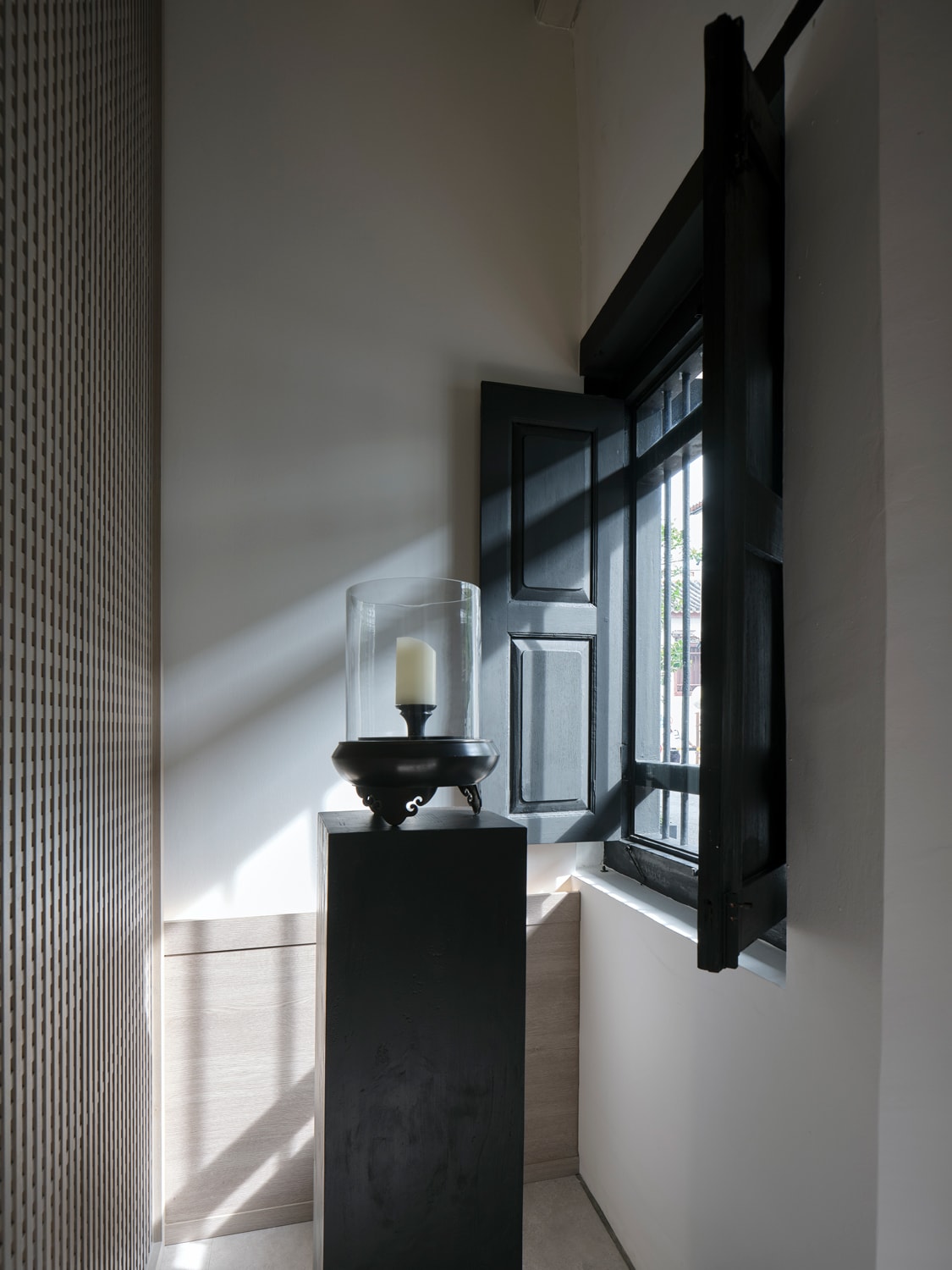 One of these memories is the phenomenological quality of his childhood home. “The shophouse was quite public so most of the time, the door was closed and inside was a dark space. When it’s dark, you have very dramatic light from the air well,” recalled Chan, as we sat in the lounge wrapped in dark timber panels, wire-brushed to bring out the grain. Light from the air well danced across these chocolate-coloured surfaces, which alternate with white lime-washed walls applied using a Venetian plaster technique, and with extruded, ribbed, glazed ceramic panels whose crackled surfaces recall traditional ceramic bowls.