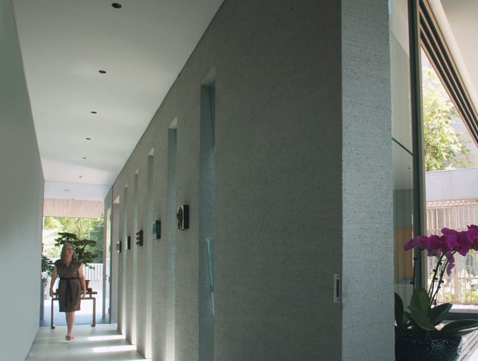 Visitors enter the home through a light and airy entrance pavilion that feels as if it is part of the natural landscape. They then amble through a narrow corridor with slit openings that offer a limited view of the courtyard.