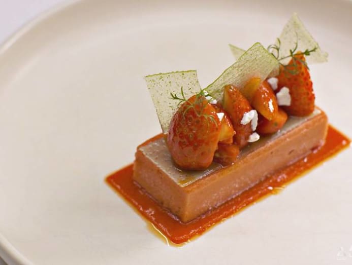 Case in point: the whimsical “J” is an ingeniously shaped “potted plant” made of black sesame mousse, yuzu cremeux and matcha. Another too-pretty-to-eat dessert combines Japanese tomato, strawberry and red pepper.