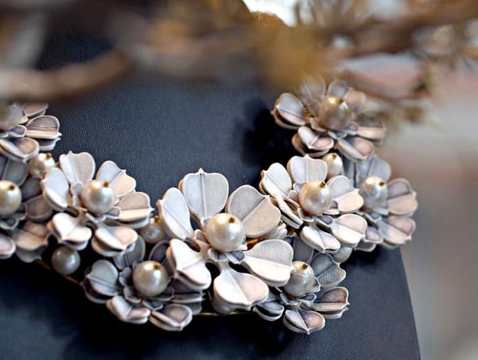 A recent collection, Rattanakosin Shadow, features flowers and shapes inspired by temple architecture, made of eco-friendly recycled paper. There are 13 pieces in all, including layered necklaces, earrings and bracelets resembling crown flowers, jasmine and chempaka.