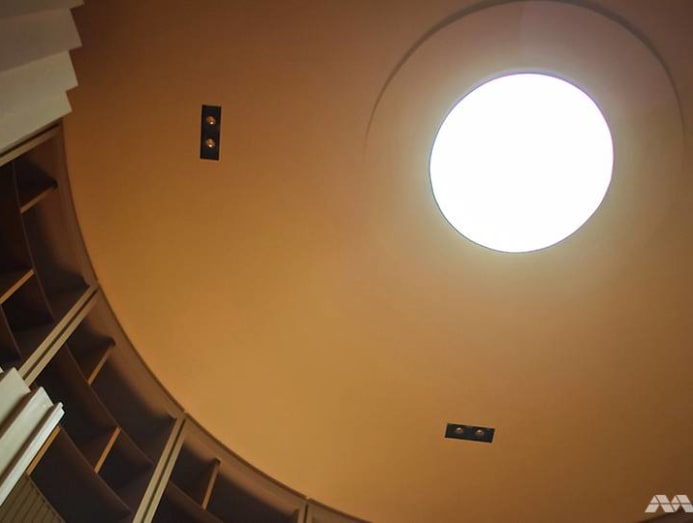 And then there’s the library, a breathtakingly dramatic cylindrical space wrapped around by books. An oculus allows sunlight not just to illuminate into the library, but also the rest of the house across several different levels.