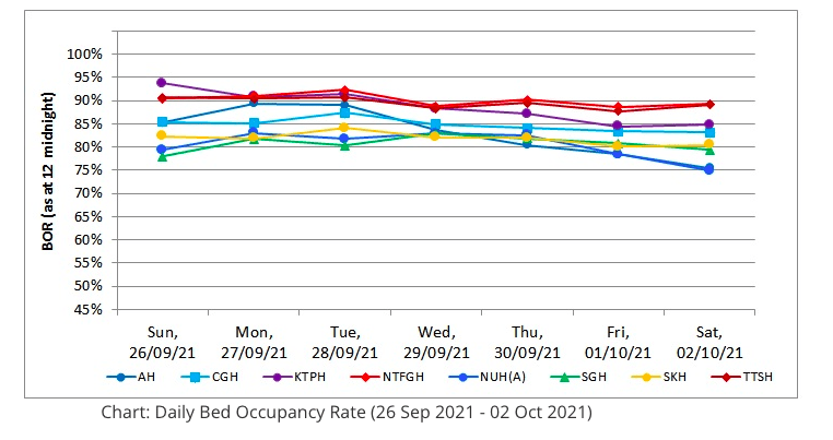Among hospitals tracked by the Ministry of Health (MOH), latest figures show that daily bed occupancy rates ranged from 75 per cent to nearly 95 per cent from Sep 26 to Oct 2.