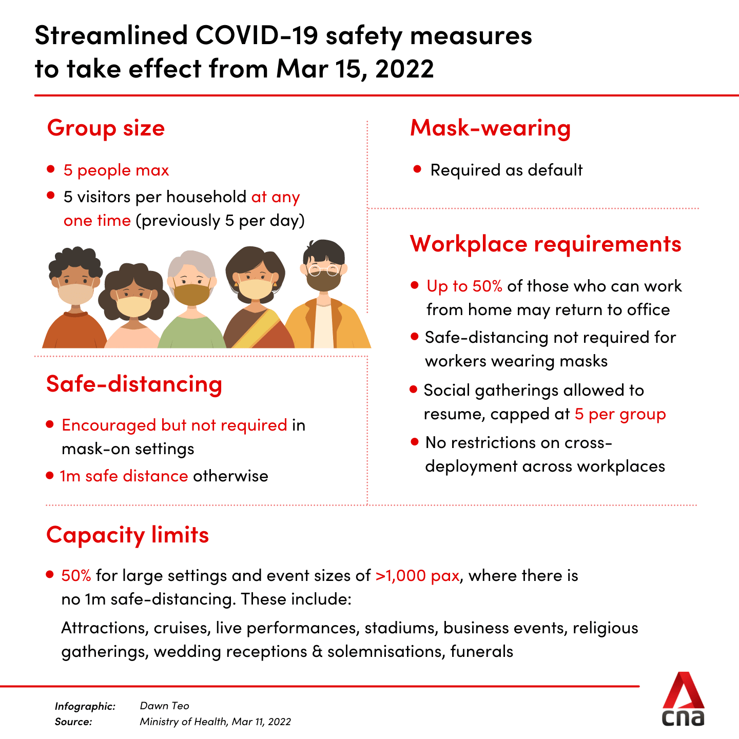 As announced by the task force previously, the rules for social gatherings will now apply to workplaces and other social settings, as long as general group size and masking rules are adhered to, said MOH.