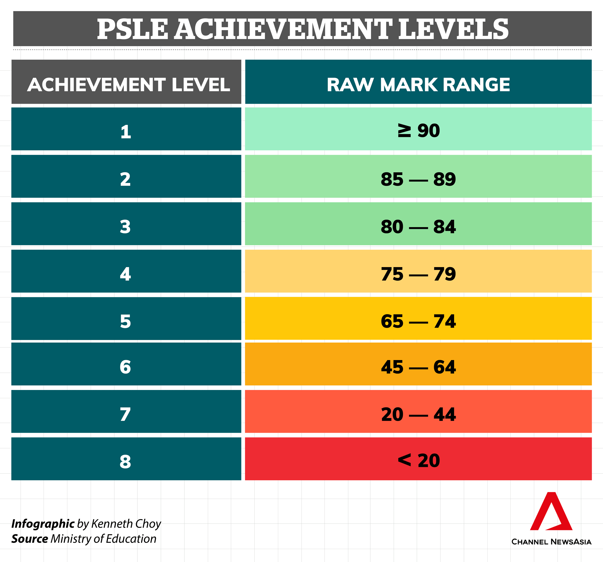 Under the new system, each PSLE student will receive Achievement Levels (AL) of 1 to 8 for each of their four subjects, with 1 being the highest possible score and 8 the lowest.