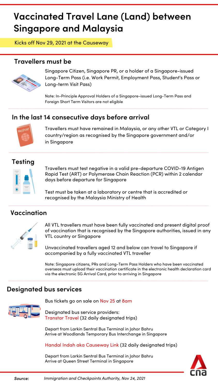 SINGAPORE: From Nov 29, Singapore and Malaysia will begin a land vaccinated travel lane (VTL) via the Causeway using designated bus services.