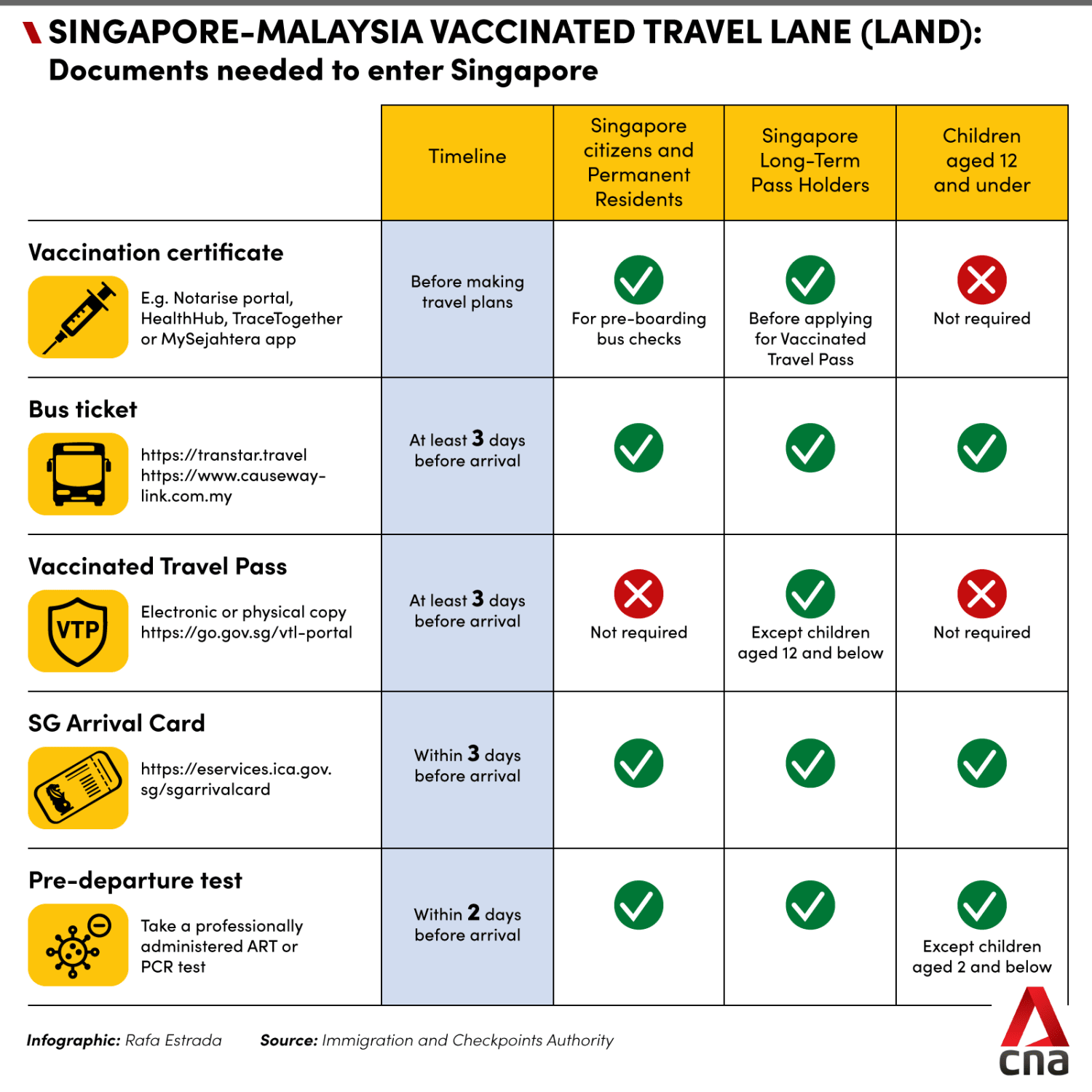 Travellers who arrive in Singapore via other means, such as private transport or walking across the Causeway, will be subjected to prevailing border control measures.