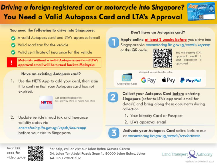 Those driving foreign-registered vehicles into Singapore must ensure they have a valid VEP/Autopass card and the Land Transport Authority's (LTA) approval email.