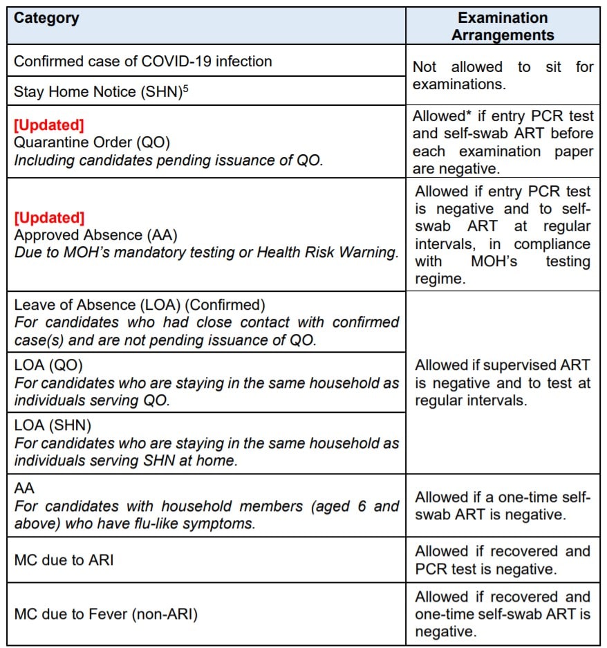 In addition to testing negative in their MOH-mandated entry PCR test, candidates must also perform self-swabs with ART kits at regular intervals and inform their schools of the outcome before their examination. This must be done until their approved absence is rescinded.