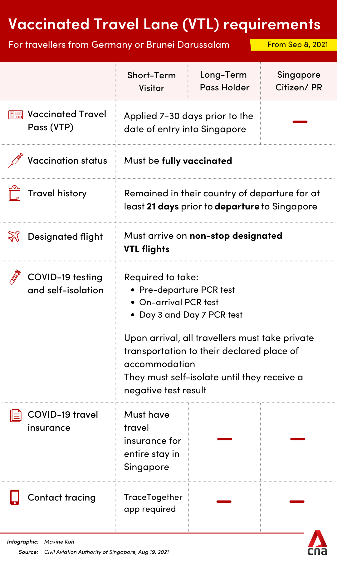 Under the Vaccinated Travel Lane, fully vaccinated travellers departing from Germany or Brunei can enter Singapore without serving a stay-home notice from Sep 8.