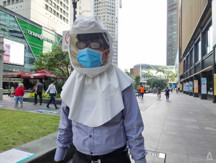 Mr Goh, who was returning to the office full-time after two years of mostly working from home, was shielded by a hood that he said was a "power-assisted personal respirator". Under that, he wore three masks - an N95 mask sandwiched by two surgical masks.